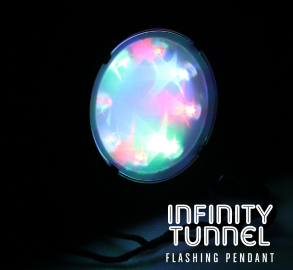 Packed with multi coloured, multi function LEDs, this flashing pendant creates a clever infinity tunnel effect as the colourful lights appear to shine from deep within the pendant. With six cool modes, you can set this colourful pendant to suit your occasion and the contrasting black outer makes the effect appear even brighter still! Supplied on a black cord with break away fixing, this party pendant has replaceable batteries included.