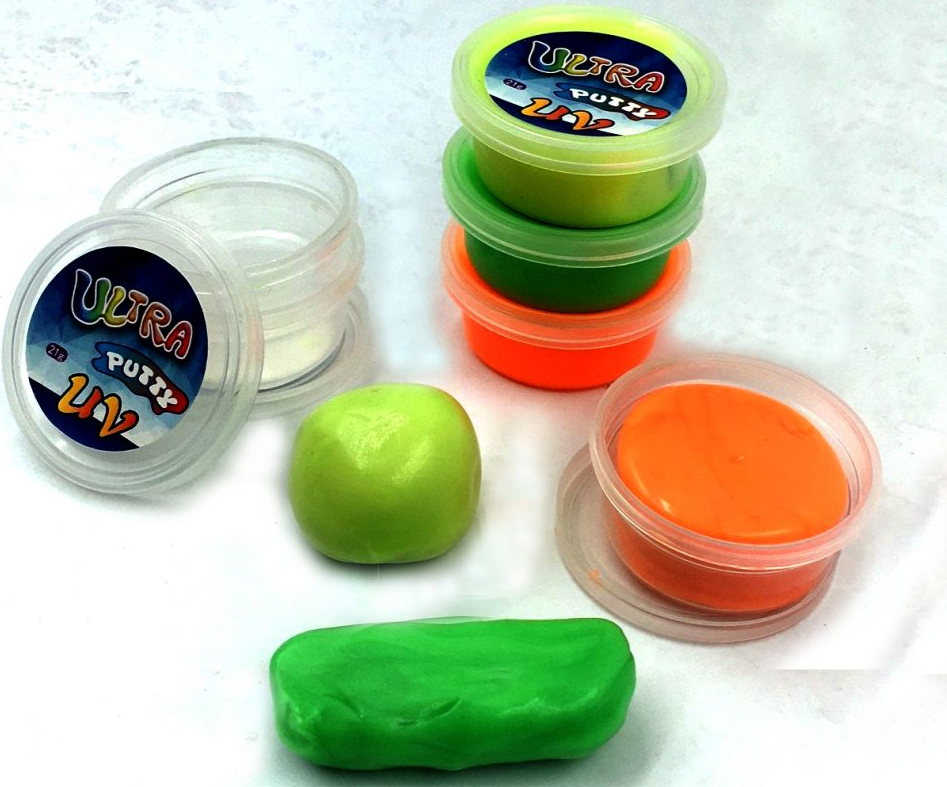 Ultra Violet Light is sometimes known as Black Light. UV light is just beyond the blue end of the colour spectrum so appears ‘invisible’ to the eye. A UV torch or light produces ultraviolet light and when combined with UV responsive material or toys produces dramatic bright vivid colours which appear to glow. UV Reactive Putty does everything that regular putty does: you can mould it, shape it, stretch, bounce it and even watch it melt! However, it?s also got an ace up its gelatinous sleeve: the UV Reactive Putty reacts to ultra-violet light and changes colour. An ideal gift for young scientists, perfect for party-bags and ideal as a stocking-filler